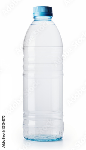 Clear Plastic Water Bottle with Blue Cap Isolated on White Background