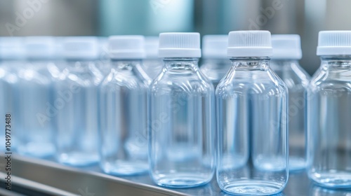 Clear plastic water bottles lined up neatly on a production line in a modern facility, showcasing hygiene and efficiency.