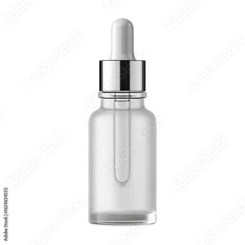 Clear rectangular glass dropper bottle with silver cap. Product for skincare or cosmetic use