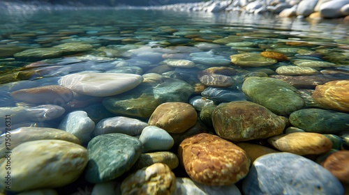 Clear river water flows over colorful, smooth stones on the riverbed.
