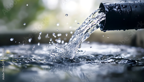 Clear water flows from pipe into stream. Closeup shot of water discharge from pipeline. Agriculture irrigation systems in action at farmland