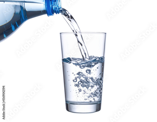 Clear water is being poured from a blue-capped bottle into a transparent glass, creating bubbles as it fills.