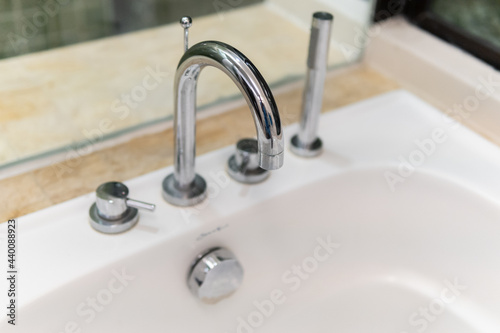 Clear water is running from shiny faucel into the sink in bathroom, closeup view. Water system in residental real estate concept.