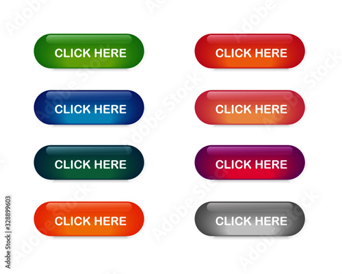 click here colorful button set. icons web isolated on white background. vector illustration.