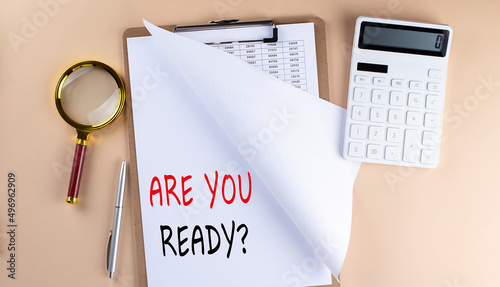 Clipboard with chart and text ARE YOU READY with magnifier ,calculator on beige background