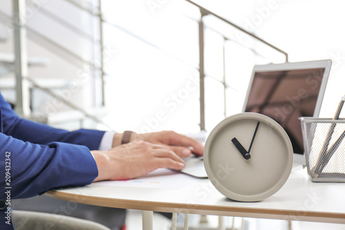 Clock and blurred man working on background. Time management