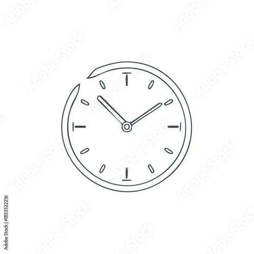 Clock line art illustration of time with hour and minute hands on white backdrop