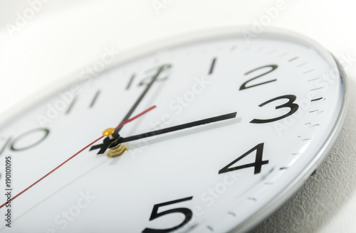 Clock on the white wall. Three o'clock.