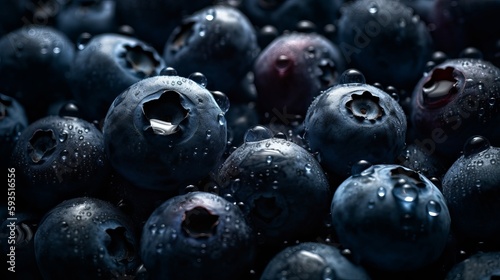 Close photo of a fresh blueberry with water droplet, suitable for your food design ads. Generative ai