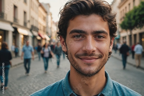 Close portrait of a smiling young Uruguayan man looking at the camera, Uruguayan city outdoors blurred background