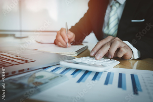Close uo of Businessman working at office with documents on his desk, doing planning analyzing the financial report, business plan investment, finance analysis concept