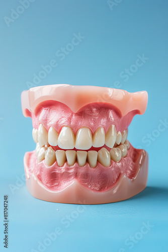 Close up , Complete denture or full denture on blue background
