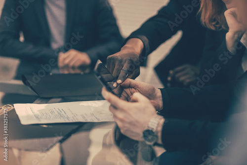 close up. business colleagues viewing messages on a smartphone