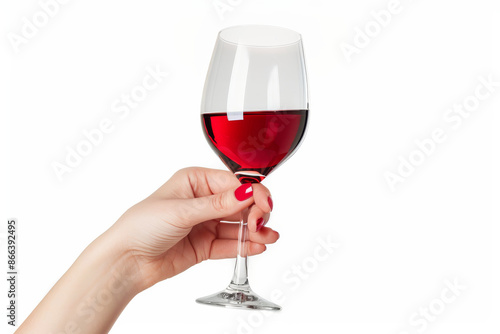 close up horizontal isolated image of a female hand holding a glass of red wine over a white neutral background