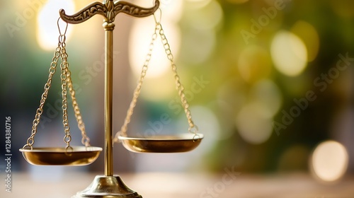 Close up image of a balanced golden scale symbolizing justice and fairness in a blurred background : Generative AI