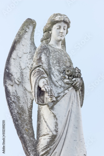 close up image of an angel figurine against a pale sky background.