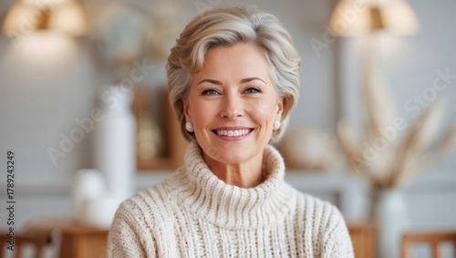 Close up image of happy good looking elegant fifty year old woman wearing warm cozy jumper, pearl earrings and short stylish hairdo being in good mood sitting in living room, smiling broadly at camera