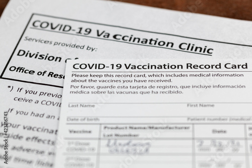 Close up isolated image of a COVID 19 vaccination record card on a wooden desk. The card details the date, type and the dose number of administred vaccine and given to every person for record.