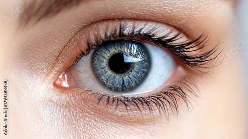 Close up of a beautiful blue eye with long eyelashes. Concept of beauty, vision, and health.