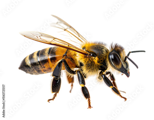 Close up of a bee with wings and legs visible against black background isolated on transparent background