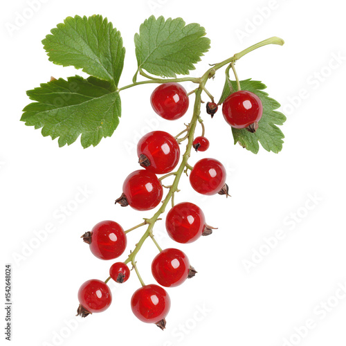Close up of a branch of red currants with green leaves on a white background