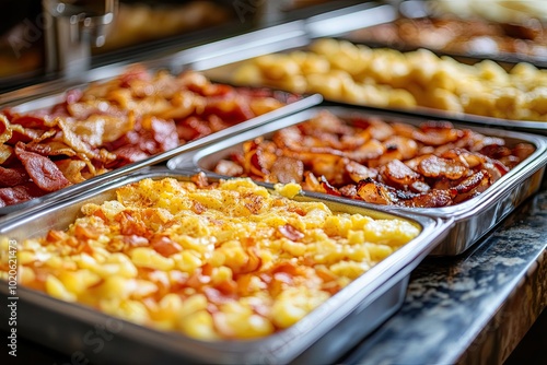 Close up of a breakfast buffet. Scrambled eggs and bacon in stainless steel pans.