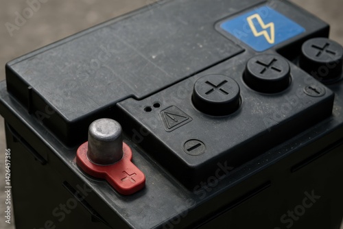 Close Up of a Car Battery with Terminal Connections and Warning Symbols