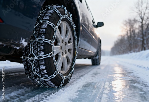 Close up of a car tire equipped with metal snow chains, driving on a frozen and icy winter road highlighting the importance of safety measures for winter.