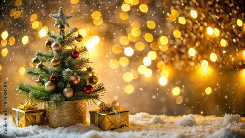 Close up of a Christmas tree on a snowy night with gold bokeh, Christmas gift boxes, and a festive background