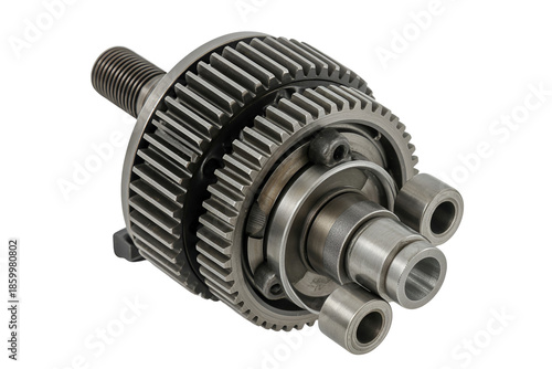 Close up of a complex mechanical differential gear assembly isolated on transparent background