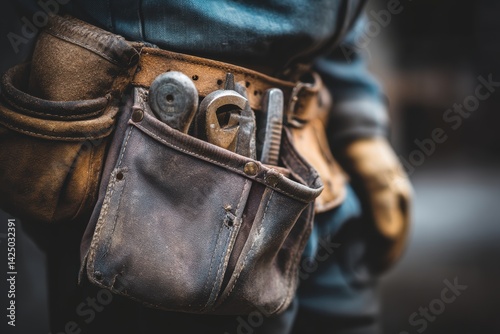 Close up of a craftsman's tool belt filled with various vintage tools with worn leather texture and soft focus on blurred background