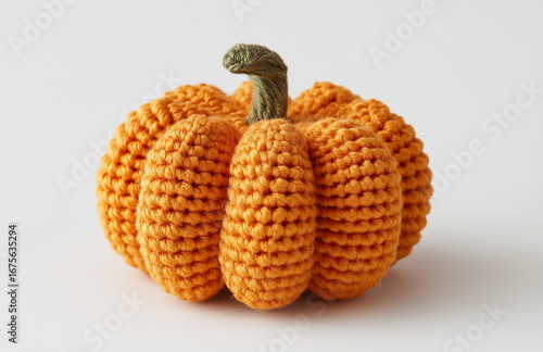 Close up of a crochet pumpkin with a green stem on a white background