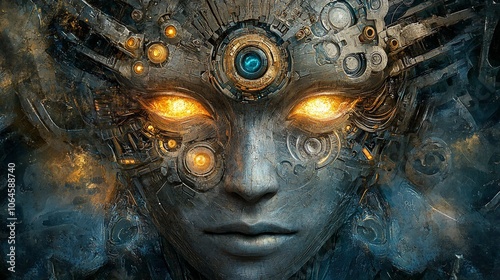 Close up of a female cyborg face with glowing eyes and a metallic body.