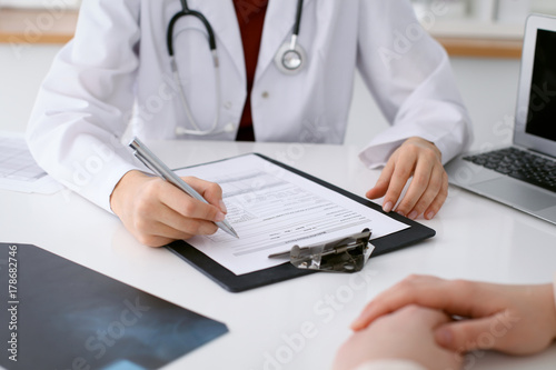 Close up of a female doctor filling up an application form while consulting patient