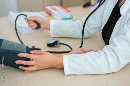 Close up of a female doctor sitting at the desk in the office. Doctor measuring blood pressure of patient in hospital. Medical and healthcare concept.