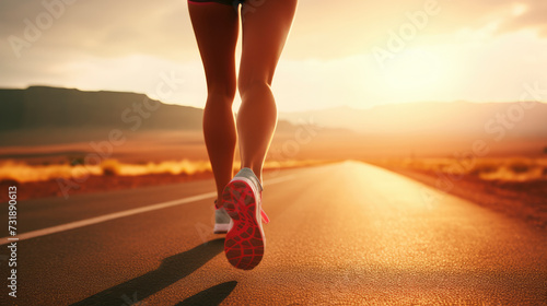 Close up of a female runners legs. Determined female runner conquering a long desert road at sunset, embodying the spirit of endurance and the pursuit of freedom