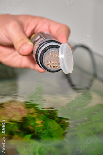 Close up of a hand feeding fish in a freshwater aquarium. Fish tank maintenance.