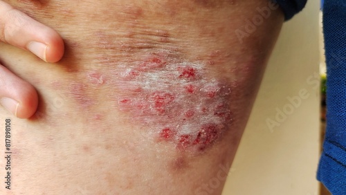 close up of a patient, showing the rash hives allergy and inflammation skin, reaction and urticaria on the leg of the woman, health care and medical concept.