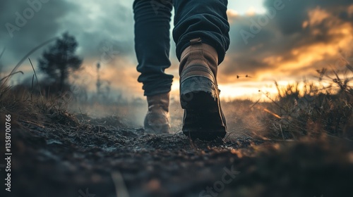 Close up of a person's feet walking on a trail with the sunset in the background