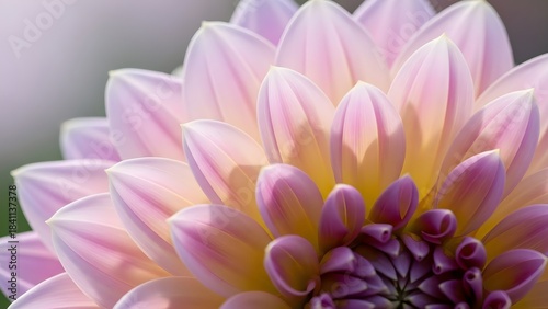 Close up of a pink dahlia flower with delicate petals and soft lighting