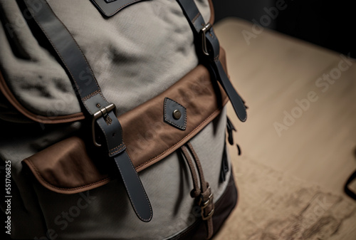 Close up of a rucksack in shades of grey and brown. Generative AI