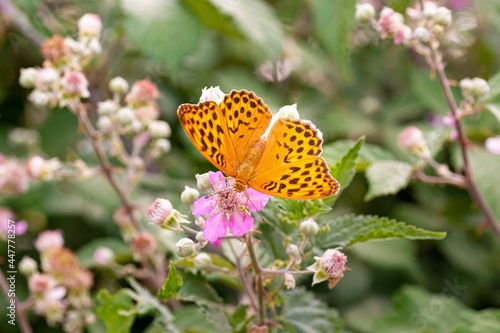 close up of a silver-washed fritillary butterfly (argynnis paphia) on a blackberry (rubus) blossom seen at Mattinata, Gargano National Park, Apulia Italy; biodiversity save the ecosystem concept