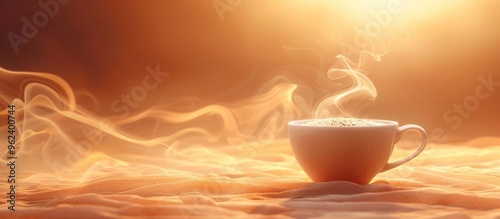 Close up of a steaming hot cup of coffee set against a warm glowing sunset backdrop creating a cozy and inviting atmosphere for a moment of relaxation and indulgence