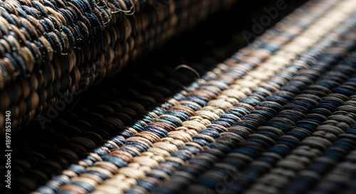 Close up of a woven fabric with intricate texture and multicolored threads
