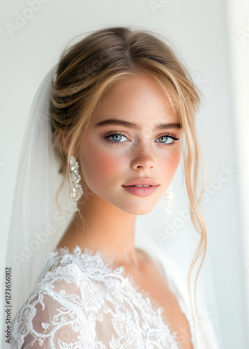 Close up of a Young Bride with Blonde Hair and Blue Eyes Wearing a Veil