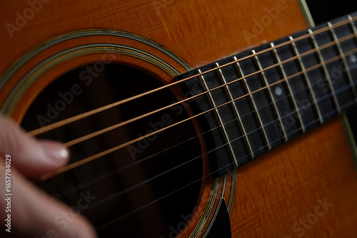 Close Up of an Acoustic Guitar with Strings and Fingerboard Being Played By a Person