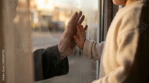 Close up of an elderly hand and a child hand touching on a glass window for connection concept