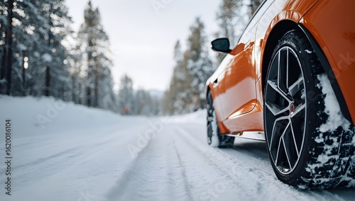 Close up of an orange car with winter tires driving on a snow covered road