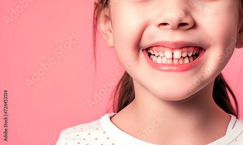 Close up of beautiful little girl smile with white teeth over plane background. Header image with empty space for text.