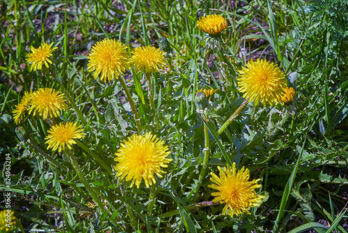 Close up of blooming yellow dandelion flowers Taraxacum officinale in garden on spring time.